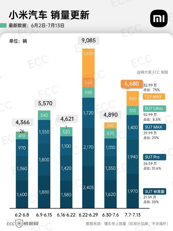 [CNMO科技消息]根据公开数据,2025年第28周(7月7日至7月13日)中国股票配资官网,小米汽车总销量约为0.66万辆,位列当周中国新能源汽车品牌销量第七名。而近日,CNMO注意到,有汽车博主曝光了小米汽车的销量细节: